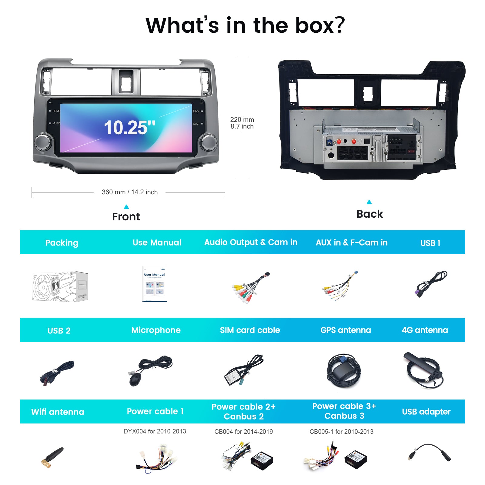 - 【Vehicle Compatibility】This 2K 10.25-inch Sliver Car Stereo fit for Toyota 4Runner 2010 2011 2012 2013 2014 2015 2016 2017 2018 2019,Complete Plug-and-Play Kit Includes Everything You Need To Install ,Retains Factory Steering Wheel Controls,Reverse Camera,OEM JBL Amplifier,Factory Antenna Adapter.
