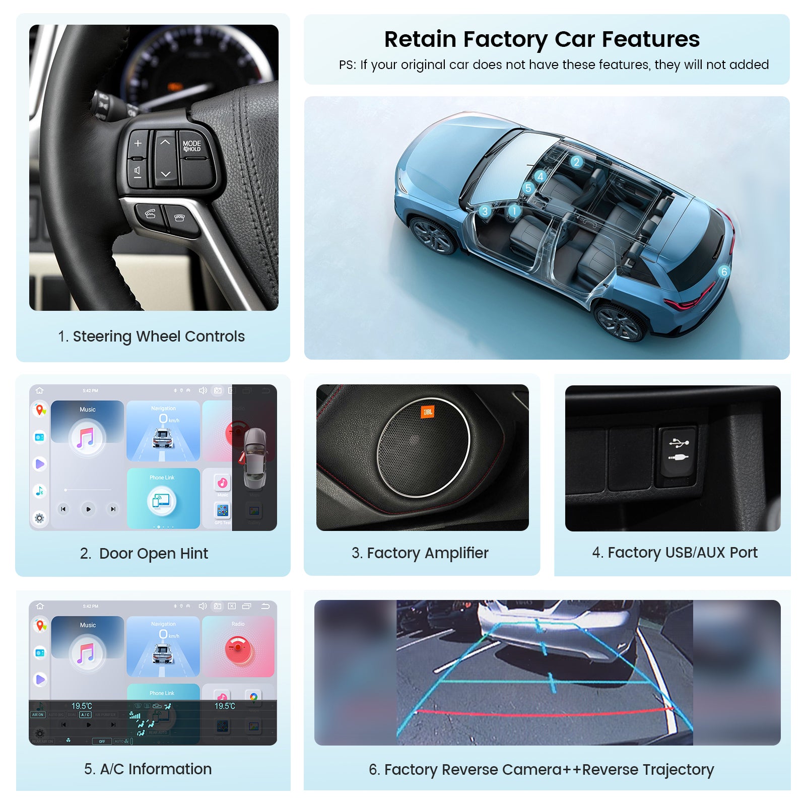 【Vehicle Compatibility】This Car Stereo fit for Toyota Highlander 2015-2019 Comes With Plug and Play Cable & Canbus, retains Factory Steering Wheel Control, 360 Camera,Rear view Camera, JBL amplifier, A/C information, Reverse Radar, Door open hints.