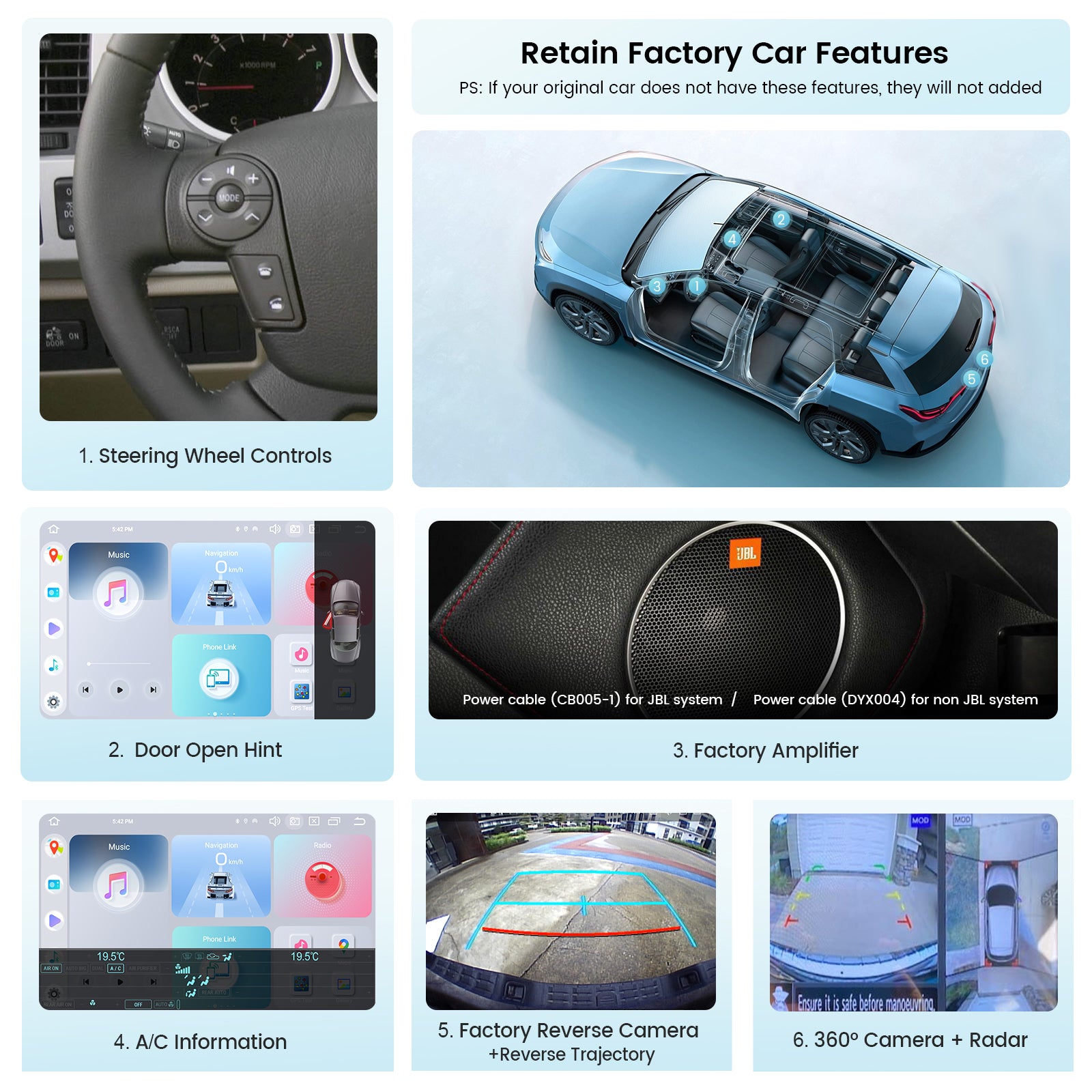 - 【Vehicle Compatibility 】This Car Radio fit for Toyota Tundra 2007 2008 2009 2010 2011 2012 2013 Sequoia 2007 to 2013,Complete Plug-and-Play Kit Includes Everything You Need To Install that Retains Original JBL amplifier, Factory Steering Wheel Controls, Factory Antenna Adapter.