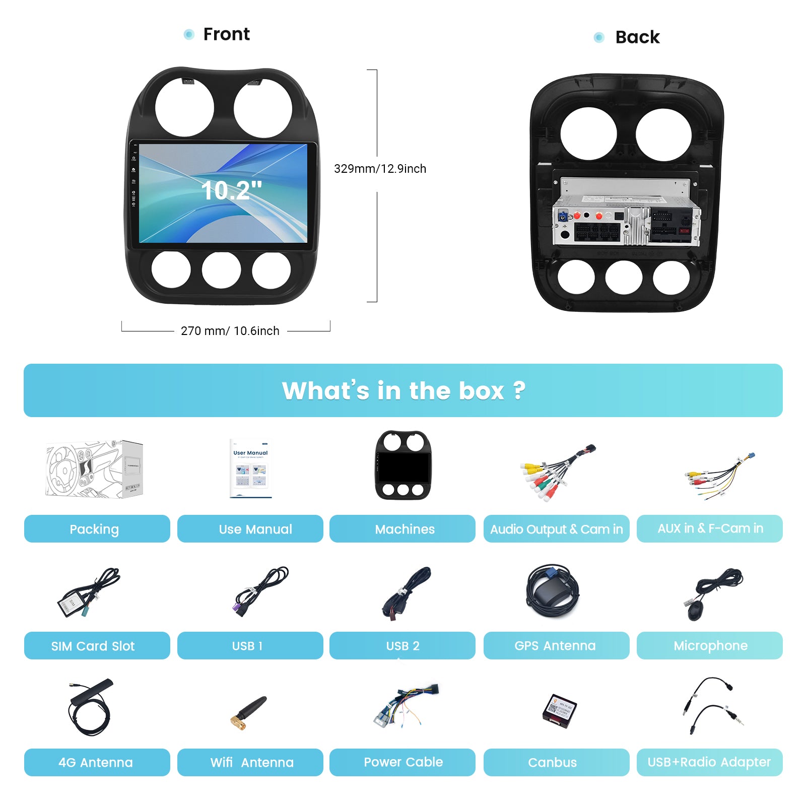 - 【Complete Package】Our package includes everything you need for a hassle-free installation, including AUX-IN&F-Cam, AUX Out& Cam in, SIM Card Slot, Dual USB cable, GPS Ant, Microphone, 4G Antenna,Wifi Ant, Canbus, USB Adapter,User Manual, and Power Cable.
