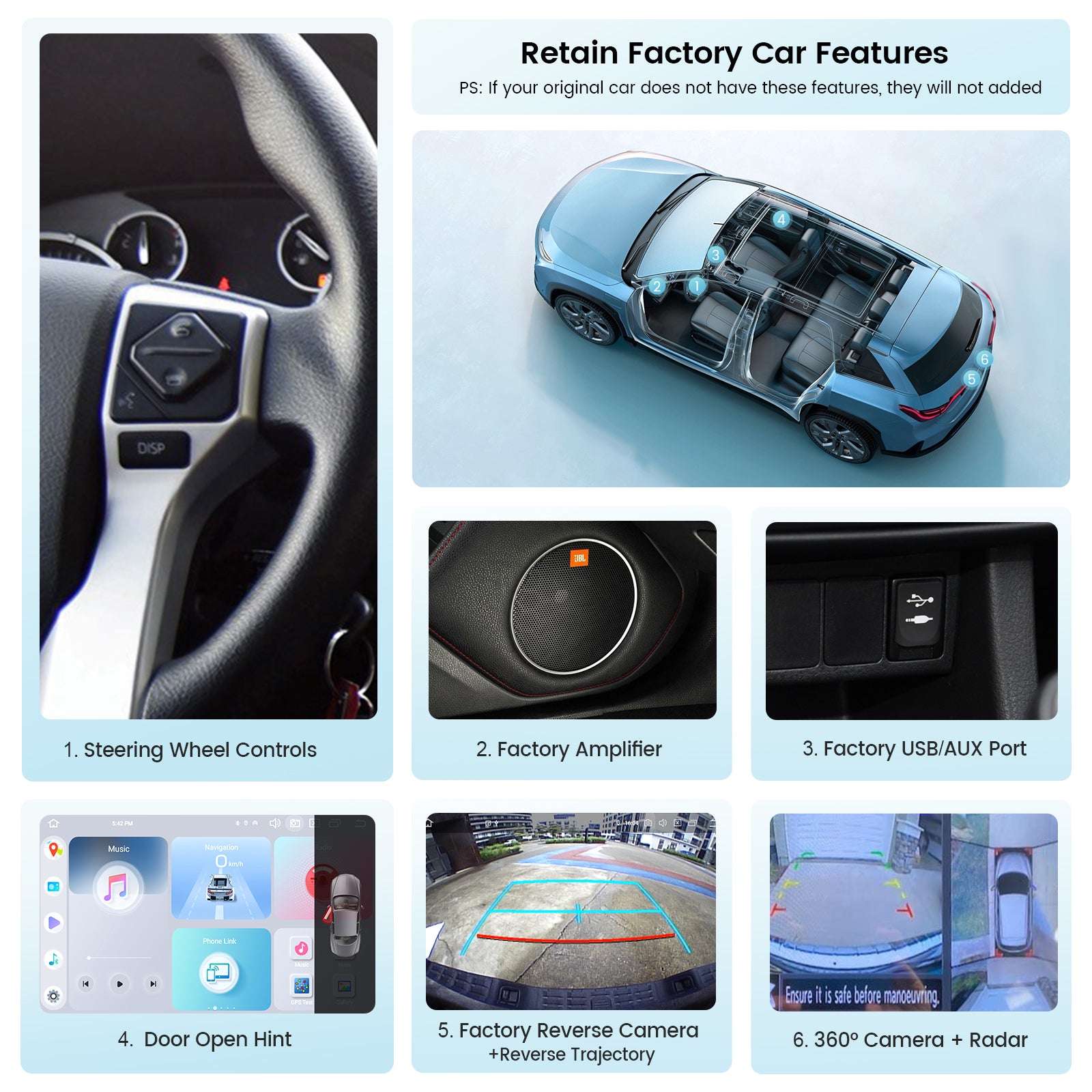 - 【Bluetooth 5.0, AM/FM,】BT 5.0 Provides faster transmission speed and longer effective distance. By connecting to your phone, you can play music and download phonebooks by hands-free calling. With the FM&AM function, you can listen to real-time radio, weather forecasts, and news.